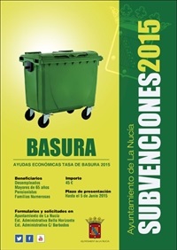 <strong>El Ayuntamiento de La Nucía recuerda que el plazo para solicitar la subvención de la Tasa de la Basura en 2015 finaliza hoy viernes 5 de junio.</strong> De esta ayuda económica podrán beneficiarse los colectivos más desfavorecidos: desempleados, mayores de 65 años, pensionistas y familias numerosas. E<strong>sta  ayuda económica se concede según el nivel de renta, para intentar que la subvención de la tasa de basura sea lo más justa posible. </strong><br />